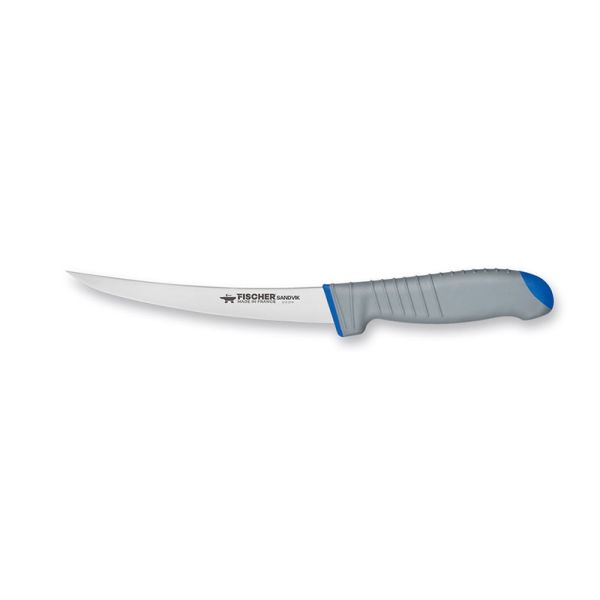 This is a top-quality semi flex boning knife with a 15cm blade made for professional butchers. The knife is perfect for de-boning big pieces of meat with precision and efficiency. The blade is made of Sandvik stainless steel: a Swedish stainless steel with a superior hardness which allows it to stay sharper for longer than other steels. It provides an outstanding cutting performance and a more durable knife edge. The ergonomic handle made the grey elastomer and blue polypropylene provides the user with non-slip long-lasting comfort making this a top quality knife for long-lasting use and performance. The fitted striations within the handle make this knife perfect for users with any size or shape of hand.