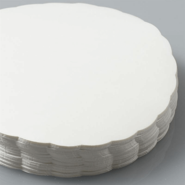 Premium white scalloped waxed greaseproof paper burger discs. Designed for presentation purposes, they give a great finish to your burgers. These separators will not fit in your press due to the scalloped edge but look great when you top and tail 5" burgers with them.